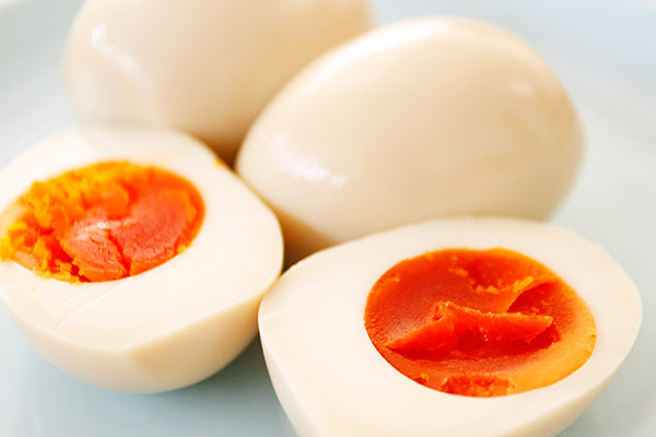 ゆでたまごに美味しい下総之国のたまごを使ひ、「味付けたまご」を作り申した。昆布や宗田節、鰹節からだしを取りし漬けダレが、これでもかとぎゅうっと染みてござる。そのまま食すはもちろん、麺類やサラダに添えたり、酒のお供などと万能の働きを見せよう。